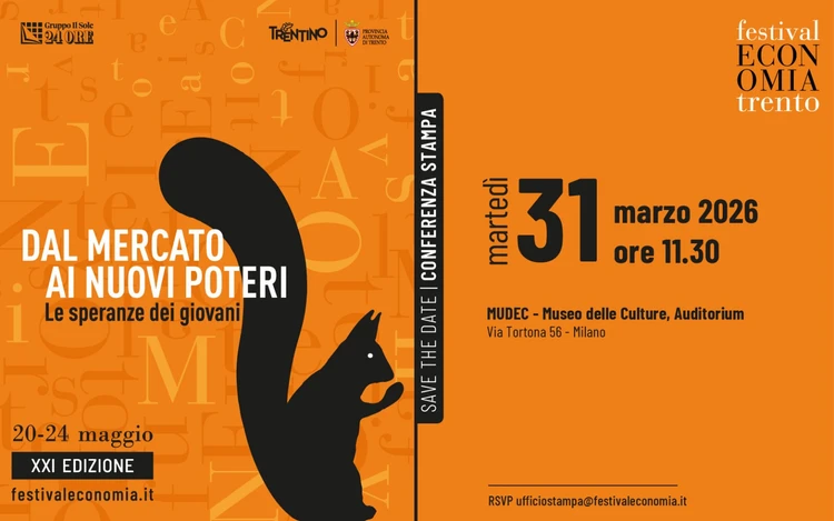 Martedì 31 marzo alle 11.30 all’Auditorium del MUDEC – Museo delle Culture di Milano sarà presentata la nuova edizione del Festival dell'Economia di Trento, in programma dal 20 al 24 maggio nel capoluogo trentino con il titolo “Dal mercato ai nuovi poteri. Le speranze dei giovani”. All’incontro interverranno il presidente della Provincia autonoma di Trento Maurizio Fugatti, il vicepresidente e assessore allo sviluppo economico Achille Spinelli, l’amministratore delegato del Gruppo Il Sole 24 ORE Federico Silvestri e il direttore del Sole 24 Ore, Radiocor e Radio 24 Fabio Tamburini, insieme al sindaco di Trento Franco Ianeselli, al rettore dell’Università degli Studi di Trento Flavio Deflorian, al presidente di Trentino Marketing Giovanni Battaiola e all’amministratore delegato Maurizio Rossini. La conferenza stampa sarà condotta dai giornalisti Giampaolo Pedrotti e Filomena Greco.